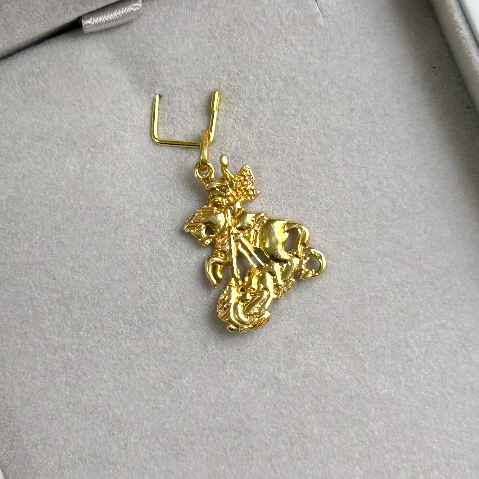 Encante-se com a proteção e o estilo atemporal do nosso pingente de ouro São Jorge. Feito com detalhes meticulosos e a elegância do ouro puro, este pingente não é apenas uma peça de joalheria, mas sim um símbolo de coragem e fé.